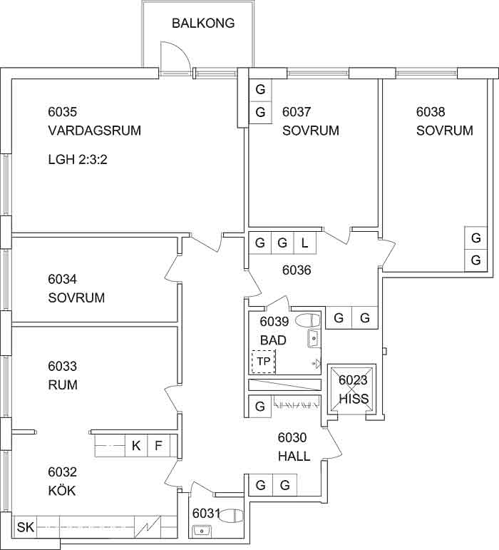 Planlösning: hall, wc, kök/allrum, sovrum, vardagsrum, hall, 2 st sovrum, wc/bad, balkong mot stadsparken. Vissa avvikelser kan förekomma på ritningen.