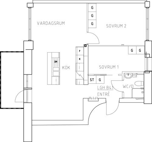 Planlösning: hall, wc/dusch, kök/vardagsrum, balkong, 2 st sovrum. Vissa avvikelser kan förekomma på ritningen.