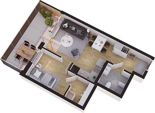 Bostäderna i kv Hägern har genomgående hög standard, både vad gäller materialval och utrustning. Lägenheterna har en modern planlösning och generös takhöjd om 268 cm samt en stor inglasad balkong.