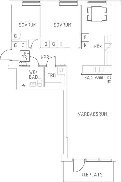 Planlösning: hall, wc/dusch, förråd, 2 st sovrum, kök, vardagsrum, balkong mot innergård. Vissa avvikelser kan förekomma på ritningen.